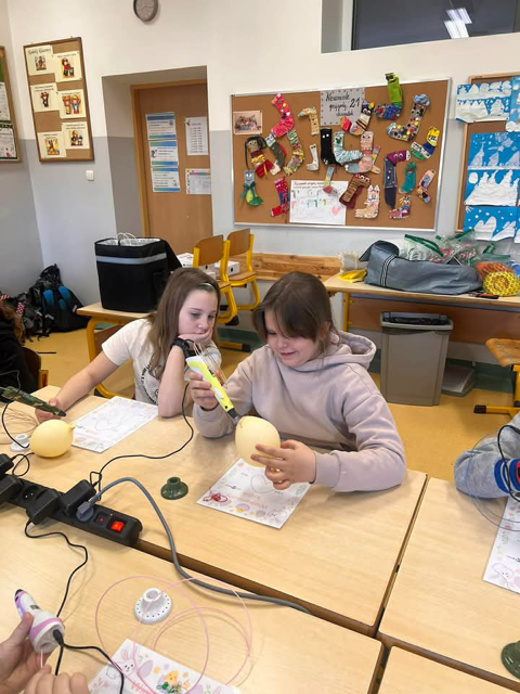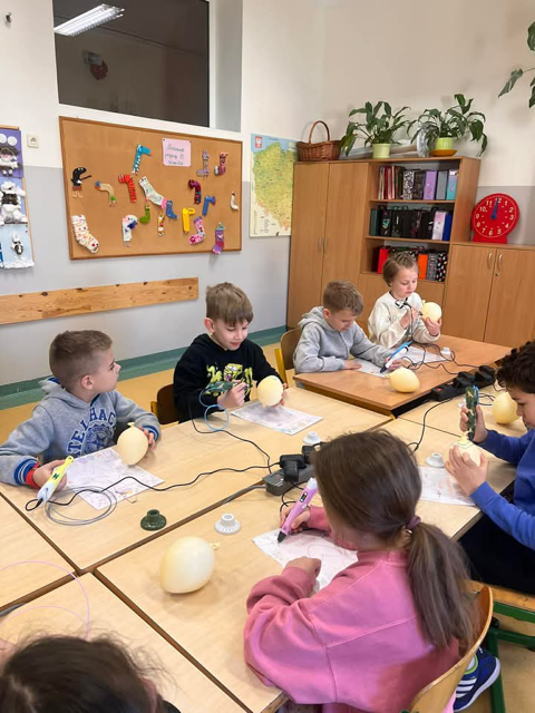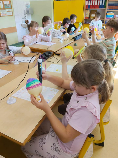 Dzisiaj w klasie 2c i 2 b królowały długopisy 3D. Uczniowie uczestniczyli w warsztatach, na których wykonywali za pomocą długopisów ozdoby wielkanocne – kurczaczki, króliczki i pisanki. Zobaczyliśmy i przekonaliśmy się, że warto stosować nowe technologi